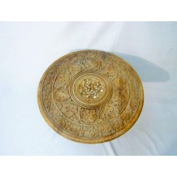 Finement sculptée, le plateau avec des cercles entoure des colliers de fleurs et de feuilles de vigne d'où s'échappe quelques grains fruitiers. Si une fissure est apparente, elle ne creuse ni ne déforme l'usage du produit.