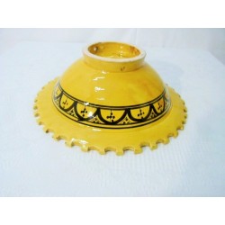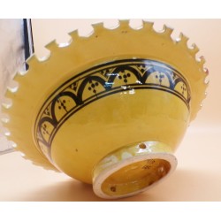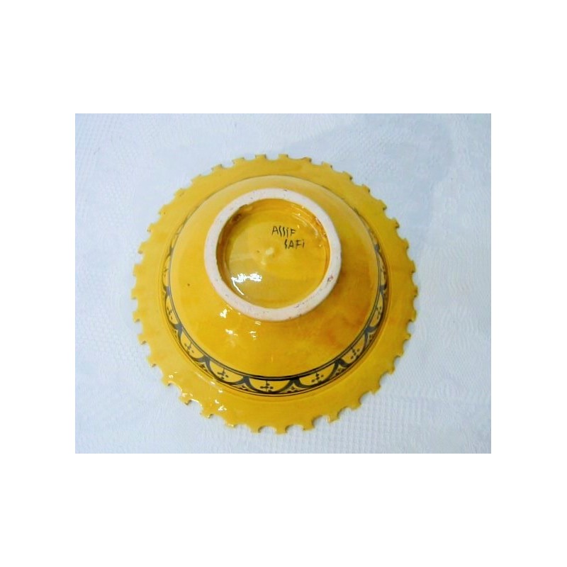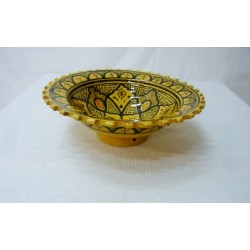 Ce plat de type oriental est jaune ocre avec des motifs généreux symétriques. On dirait qu'il est fait pour le tajine. En très bon état, juste un bout de peinture enlevé insignifiant.